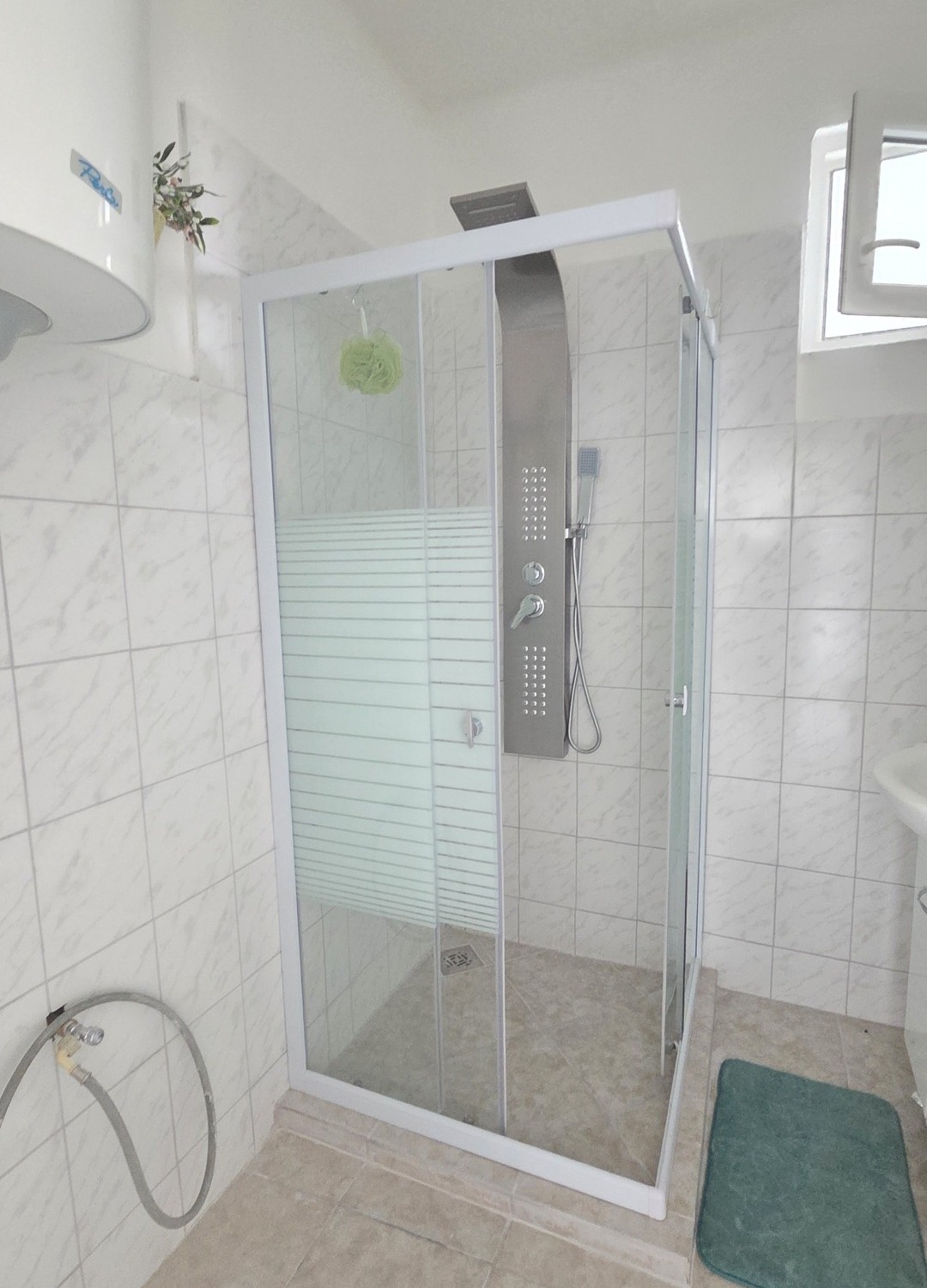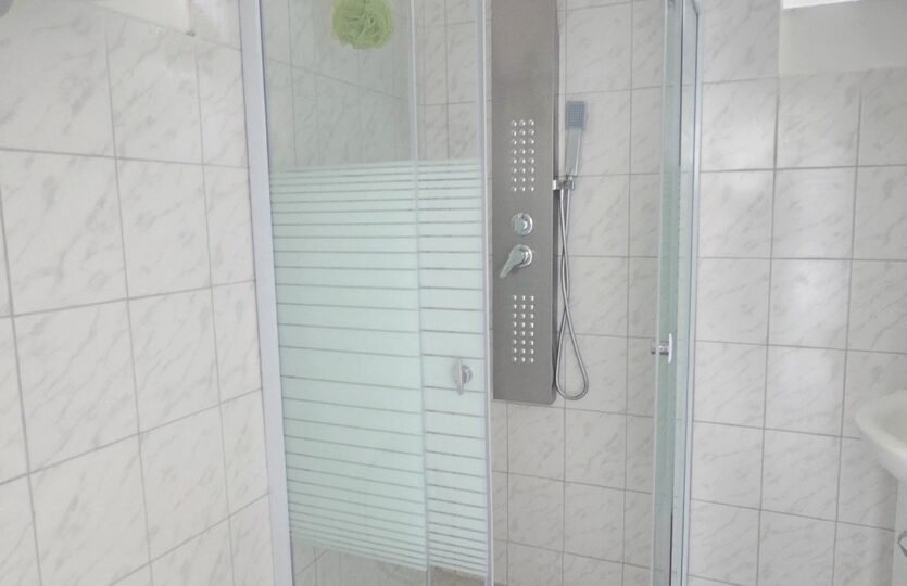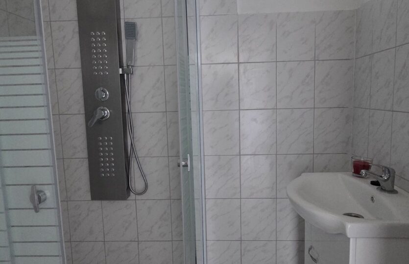 A fürdőszoba külön említést érdemel: ízlésesen kialakított, modern megoldásokkal felszerelt, ahol a minőségi burkolatok, a harmonikus színvilág és a praktikus elrendezés együttesen teremtenek elegáns, mégis otthonos hangulatot.